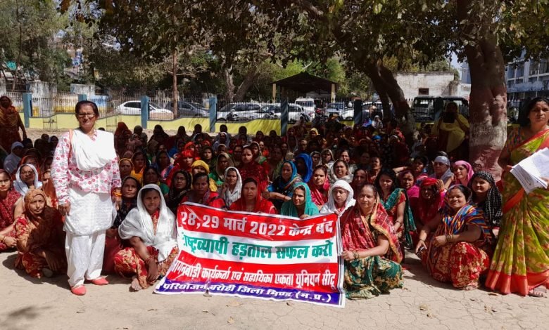 भिण्ड आँगनबाड़ी कार्यकर्ता एवं सहायिका एकता यूनियन मप्र जिला इकाई भिण्ड के तत्वावधान में जिलेभर में परियोजना स्तर पर आंगनबाड़ी कार्यकर्ताओं व सहायिकाओं ने मंगलवार को प्रदर्शन उपरान्त अपनी माँगों के सम्बन्ध में मुख्यमंत्री एवं प्रधानमन्त्री के नाम एसडीएम / परियोजना अधिकारियों को ज्ञापन सौंपे। ज्ञापन में आँगनबाड़ी कर्मियों को नियमित करने, तब तक न्यूनतम वेतन एवं समाजिक सुरक्षा योजनाओं को लाभ दिलाए जाने, जन विरोधी नीतियों को वापस लेने आगनबाड़ी परियोजनाओं सार्वजनिक उद्योगों का निजीकरण रोकने की मांग की गई। ज्ञापन में कहा गया है कि महिला एवं बाल विकास विभाग में कार्यरत आंगनबाड़ी कार्यकर्ता एवं सहायिकाओं के लिए वेतन का कोई प्रावधान न किया जाकर मानदेय पर काम कराया जा रहा है और 35-40 वर्ष की सेवा करने के बाद भी कार्यकर्ता सहायिकाओं को कर्मचारी का दर्जा न्यूनतम वेतन एवं सामाजिक सुरक्षा योजनाओं के लाभ से वंचित रखा जा रहा है। सेवानिवृत्ति पर पेंशन आदि का कोई भी लाभ नहीं दिया जाता है। ज्ञापन में आँगनबाड़ी कार्यकर्ता एवं सहायिकाओं को कर्मचारियों के रूप में नियमित किए जाने एवं न्यूनतम वेतन 26 हजार रुपए तथा सेवा निवृत्ति पर 10 हजार रुपए मासिक पेंशन सहित सामाजिक सुरक्षा लाभ दिलाए जाने की मांग की गई है। बजट में आईसीडीएस के लिए पर्याप्त राशि का प्रावधान किए जाने सेवानिवृत्ति पर कार्यकर्ता को 5 लाख रुपए दिए जाने, सहायिकाओं के लिए मेडिकल बोर्ड द्वारा जारी आयु प्रमाण पत्र मान्य किए जाने, श्रम कानूनों का लाभ दिलाए जाने, कार्यकर्ता का पद रिक्त होने पर सहायिकाओं को उसी केन्द्र पर पदोन्नत किए जाने, केन्द्रों के लिए ग्रीष्मकालीन अवकाश घोषित सहायिका मौजूद रहीं।