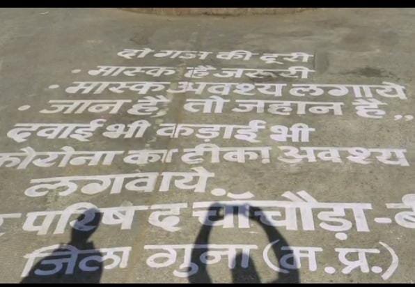 चांचौडा़-बीनागंज नगर परिषद द्वारा लोगों को जागरूक करने के उद्देश्‍य से शहर के मुख्‍य चौराहे पर कोरोना से बचाव संबंधी स्‍लोगन ऑयल पेंट से सड़क पर लिखवाए गए हैं। यह स्‍लोगन लोगों की जागरूकता के लिए अच्‍छा प्रभाव छोड़ रहे हैं।