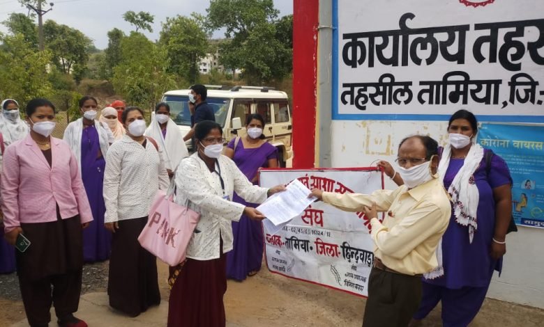 तामिया –कोरोना योद्धा का दर्जा नियमितिकरण वेतन बढ़ाने की रखी मांग को लेकर आशा कार्यकर्ताओं सहयोगिनियो ने तहसील मे दिया ज्ञापन
