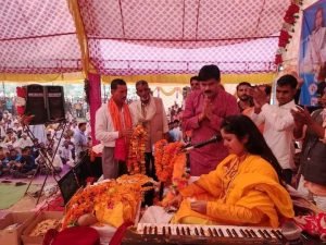 भिंड- नगरीय प्रशासन आवास राज्यमंत्री ओ पी एस भदौरिया ने कचनार कला में चल रही श्रीमद् भागवत कथा में पहुँचकर आरती की