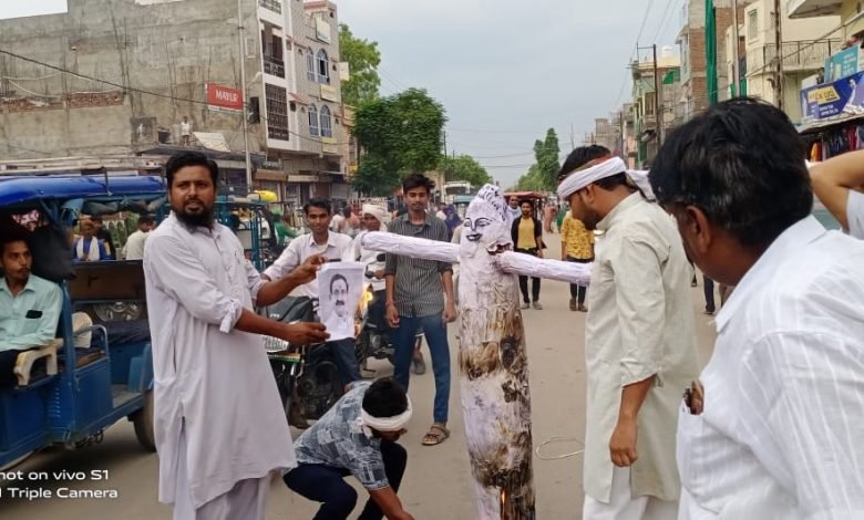सबलगढ़/ भोपाल में राजा दिग्विजय सिंह को लेकर युवक कांग्रेस के खत्म होने की टिप्पणी गृह मंत्री नरोत्तम मिश्रा के द्वारा की गई थी जिसके विरोध में राम मंदिर तिराहे पर विधानसभा प्रभारी अभिषेक पचौरी के नेतृत्व में क्षेत्रीय विधायक बैजनाथ कुशवाहा तथा अन्य कांग्रेसी जनों की उपस्थिति में गृह मंत्री नरोत्तम मिश्रा का पुतला दहन किया गया। पचौरी ने कहा कि बीजेपी सरकार लगातार खोखले वादे करते जा रही है जिससे प्रदेश में अराजकता फैल रही है ,प्रदेश की शिवराज सरकार नाकाम साबित हो रही है बेटियां घर के बाहर तथा घर में भी सुरक्षित नहीं है | पुतला बहन के दौरान क्षेत्रीय विधायक ने प्रदेश सरकार पर हमला बोलते हुए कहाकी भाजपा सरकार धृतराष्ट्र की तरह आंखें बंद करके प्रदेश का विनाश करने में लगी है , कानून व्यवस्था बनाए रखने में प्रदेश सरकार नाकाम साबित हो रही है दुष्कर्म निरंतर बढ़ते जा रहे है ऐसी सरकार को सत्ता से हटा कर सुशासन लाने का प्रयास करेंगे जिससे भारत में पुनः महाभारत न हो अन्यथा प्रदेश ही नहीं बल्कि पूरा देश ही नष्ट होने के कगार पर पहुंच जाएगा | पुतला दहन के समय कांग्रेसी विधायक बैजनाथ कुशवाहा,विधानसभा प्रभारी अभिषेक पचौरी, प्रदेश प्रतिनिधि जगदीश बंसल, एड राजेंद्र सिंह जादौन, जितेंद्र बाथम, अनिल बाथम, वाजिद खान, श्रीराम गुर्जर, राजेंद्र बाथम, मनोज पचौरी ,रवि जादौन, रामवीर शर्मा, राजवीर धाकड़ ईनायत खान, श्यामू तोमर, सतेंद्र तोमर ,शिवा बाथम आदि कांग्रेसी कार्यकर्ता उपस्थित रहे|